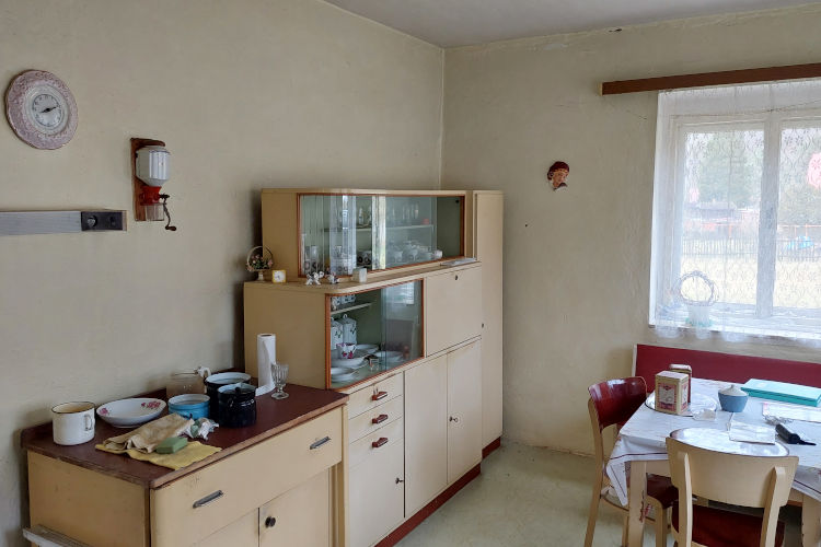 Rodinný dům nabízí dvě velké místnosti, kuchyň a centrální schodiště v přízemí,
